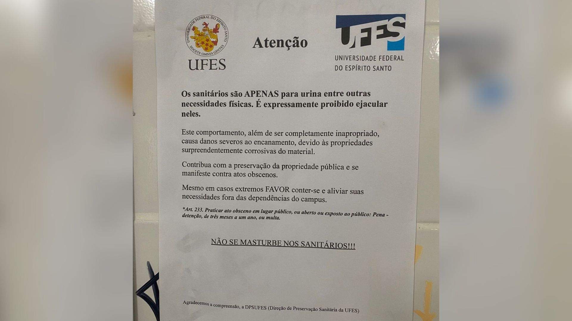 Um cartaz atraiu a atenção de estudantes da Universidade Federal do Espírito Santo (Ufes) e gerou polêmica nesta quarta-feira (18). O aviso dizia que é “expressamente proibido ejacular” nos sanitários dos banheiros do campus.