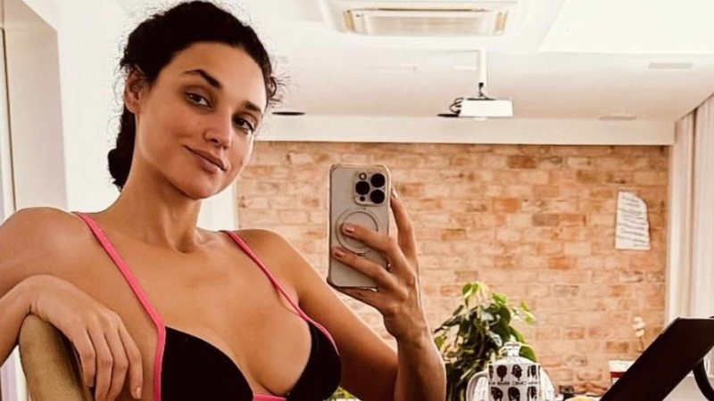 Com uma selfie no espelho, a musa revelou suas curvas esculturais ao surgir com um biquíni preto e rosa. Fazendo pose sem muito esforço, a artista apareceu sem maquiagem e com os cabelos presos diante de uma mesa com um computador em cima. Débora Nascimento então deu um show de beleza natural ao esbanjar sua barriga reta.