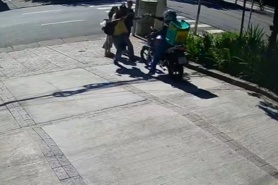 As imagens mostram que o homem andava pela calçada quando um casal de pedestres, que andava em sentido contrário, foi abordado por um motociclista com mochila de entregador de aplicativo.