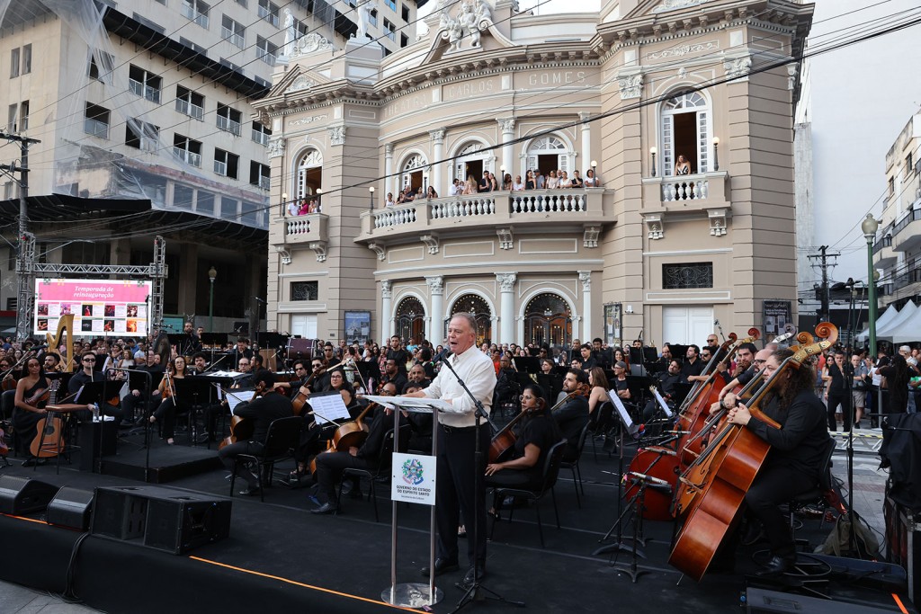 “Noventa e nove anos depois de sua inauguração, estamos reinaugurando o Theatro Carlos Gomes totalmente restaurado. Este é um equipamento importantíssimo para a cultura do nosso Estado. Resgatamos um espaço que sempre foi o centro cultural do Espírito Santo e, assim, colocamos fim a um problema histórico, que era manter esse teatro fechado. A partir de agora, teremos uma programação cultural forte e vamos fortalecer ainda mais o Centro da nossa Capital”, afirmou o governador Casagrande, acompanhado pela primeira-dama do Estado, Maria Virginia.